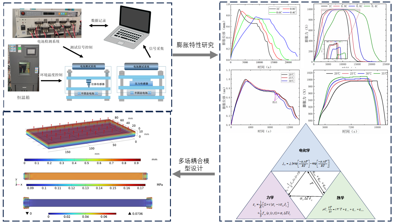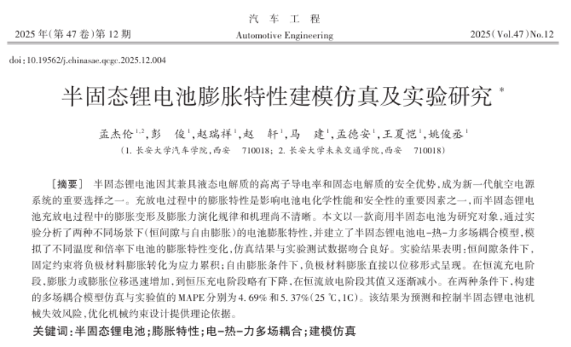 2022级本科生孟杰伦等在《汽车工程》上发表题为《半固态锂电池膨胀特性建模仿真及实验研究》的研究成果。论文以一款商用半固态电池为研究对象,建立多场耦合模型,解析电池膨胀演化规律与机理,为飞行汽车动力电池系统设计提供理论指导。该论文孟杰伦为第一作者,通讯作者为汽车性交视频彭俊老师。