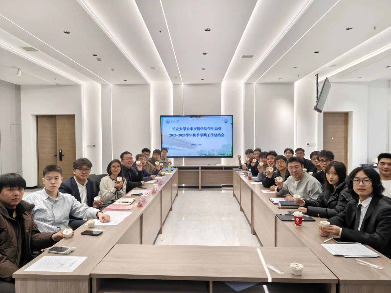 于北校区弘毅大厦未来大师堂召开2025-2026学年第一学期学生助管工作总结会。院学生事务部主任刘志兴、团委书记曾晓阳、辅导员范荣欣、全体学生助管参加会议。